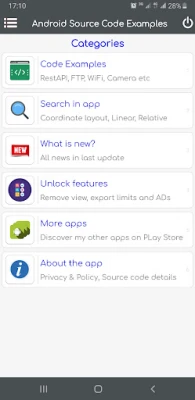 This app is focused on example codes to Develop Android Application with Android Studio. If you want to make your android app in Android Studio this app is just for you. The examples here can be exported and run directly on Android Studio. And you can view source code without exporting it. I have tried to give examples with basic code examples. You do not need internet connection to view or export the source codes. All exported source codes supported from Android 4.4 API 19+ (KitKat). Below I have listed the gradle details of Source codes:
